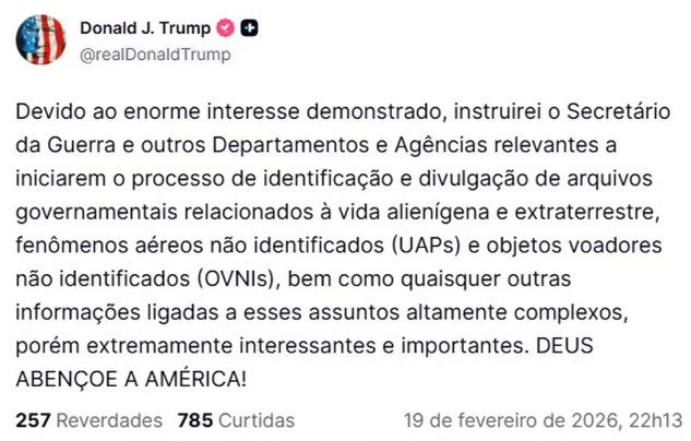 Para trazer o protagonismo para si, O presidente americano Donald Trump afirmou que instruiu o Secretário da Guerra e outros Departamentos e Agências a divulgarem documentos governamentais sobre “vida alienígena e extraterrestre, fenômenos aéreos não identificados (UAPs) e objetos voadores não identificados (OVNIs)”.